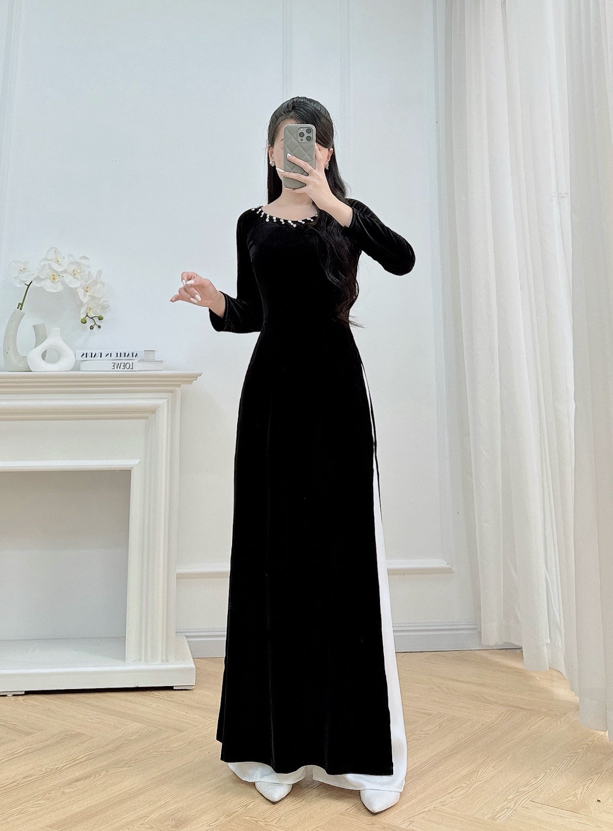 Black Velvet Vietnamese Ao Dai Dress β Traditional Long Sleeve Ao Dai with Pearl Neckline & Pants β Elegant Formal Ao Dai for Women