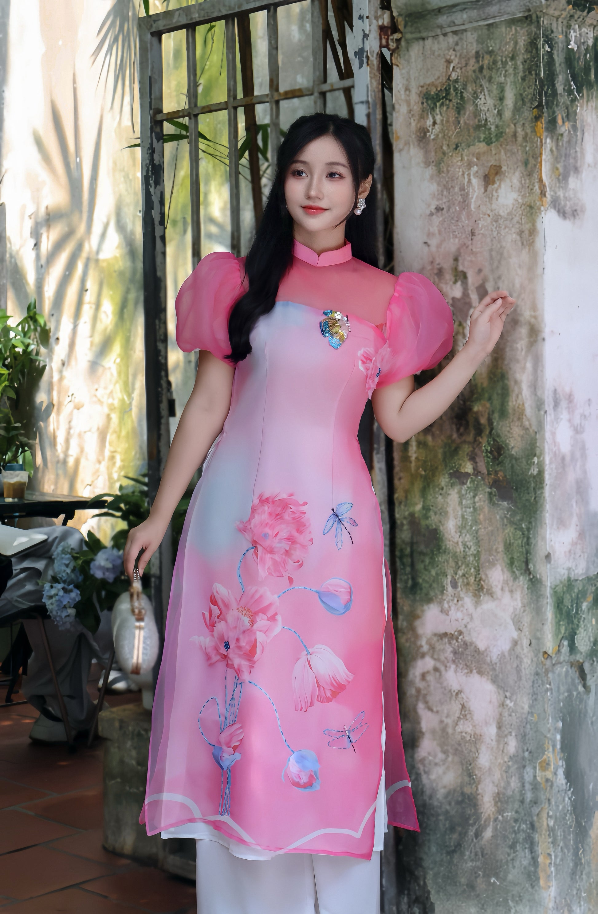A refreshing touch of nature and grace, delicately crafted from soft chiffon and beautifully embroidered with cherry blossom motifs. This design blends traditional charm with modern grace, perfect for special occasions such as Lunar New Year (Tết), engagement ceremonies, pre-wedding shoots, or cultural celebrations.