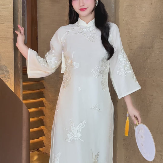 A refreshing touch of nature and grace, delicately crafted from soft chiffon and beautifully embroidered with cherry blossom motifs. This design blends traditional charm with modern grace, perfect for special occasions such as Lunar New Year (Tết), engagement ceremonies, pre-wedding shoots, or cultural celebrations.