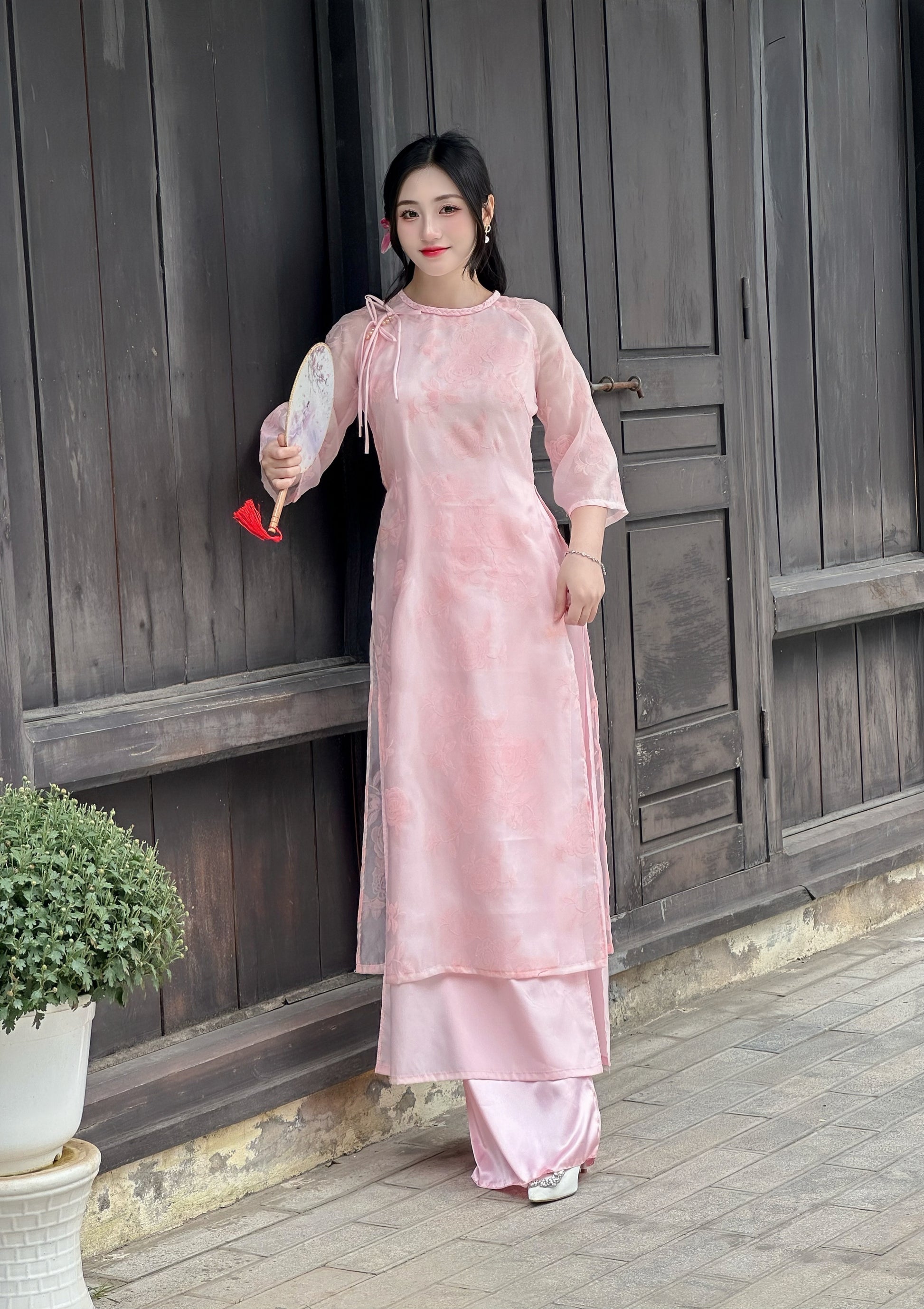 Pre-order: Set Pink Vietnamese Ao Dai with Rose Pattern | Vietnamese Ao Dai Dress