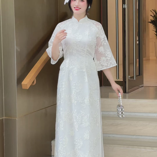 Set White Vietnamese Ao Dai with Floral embroidery | Modern Vietnamese Ao Dai
