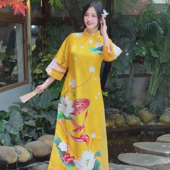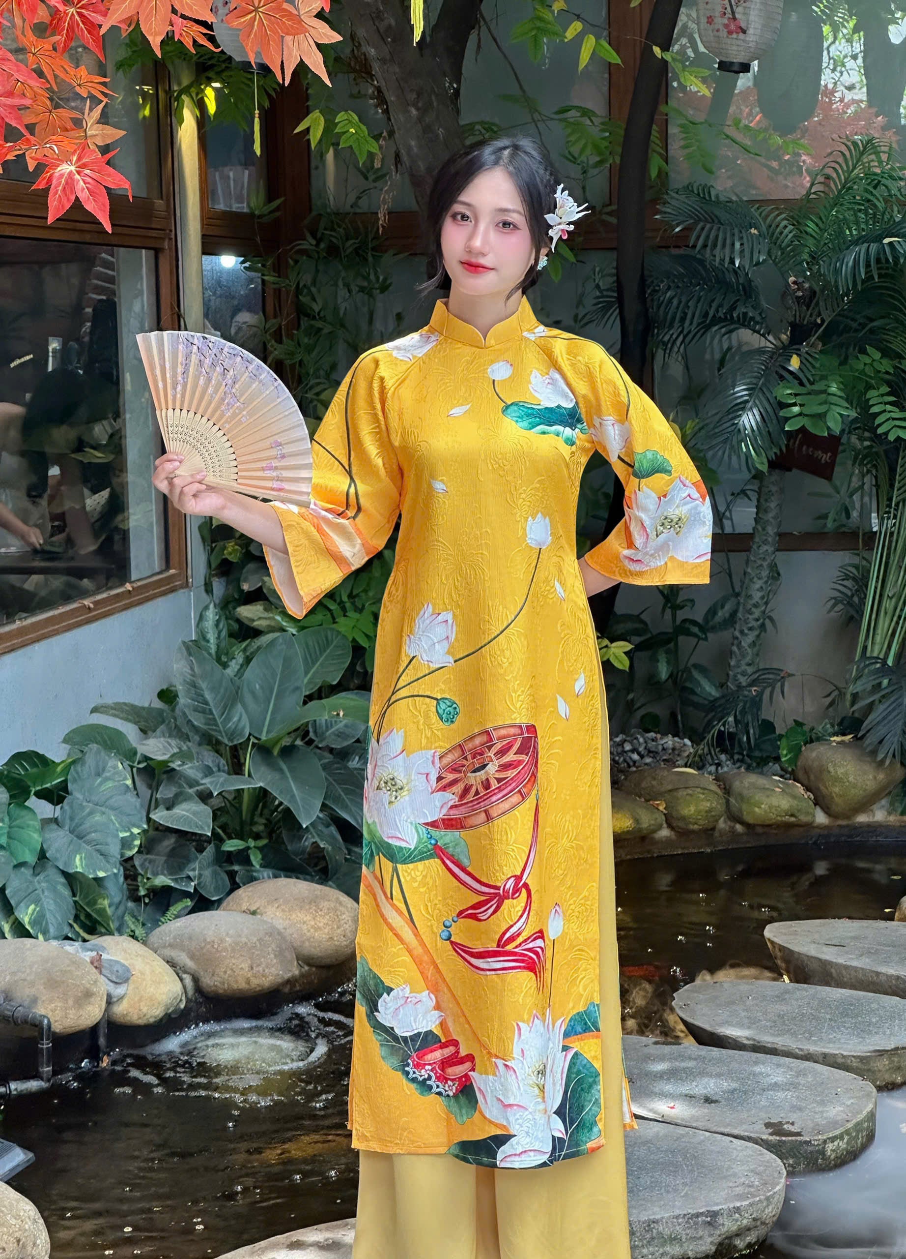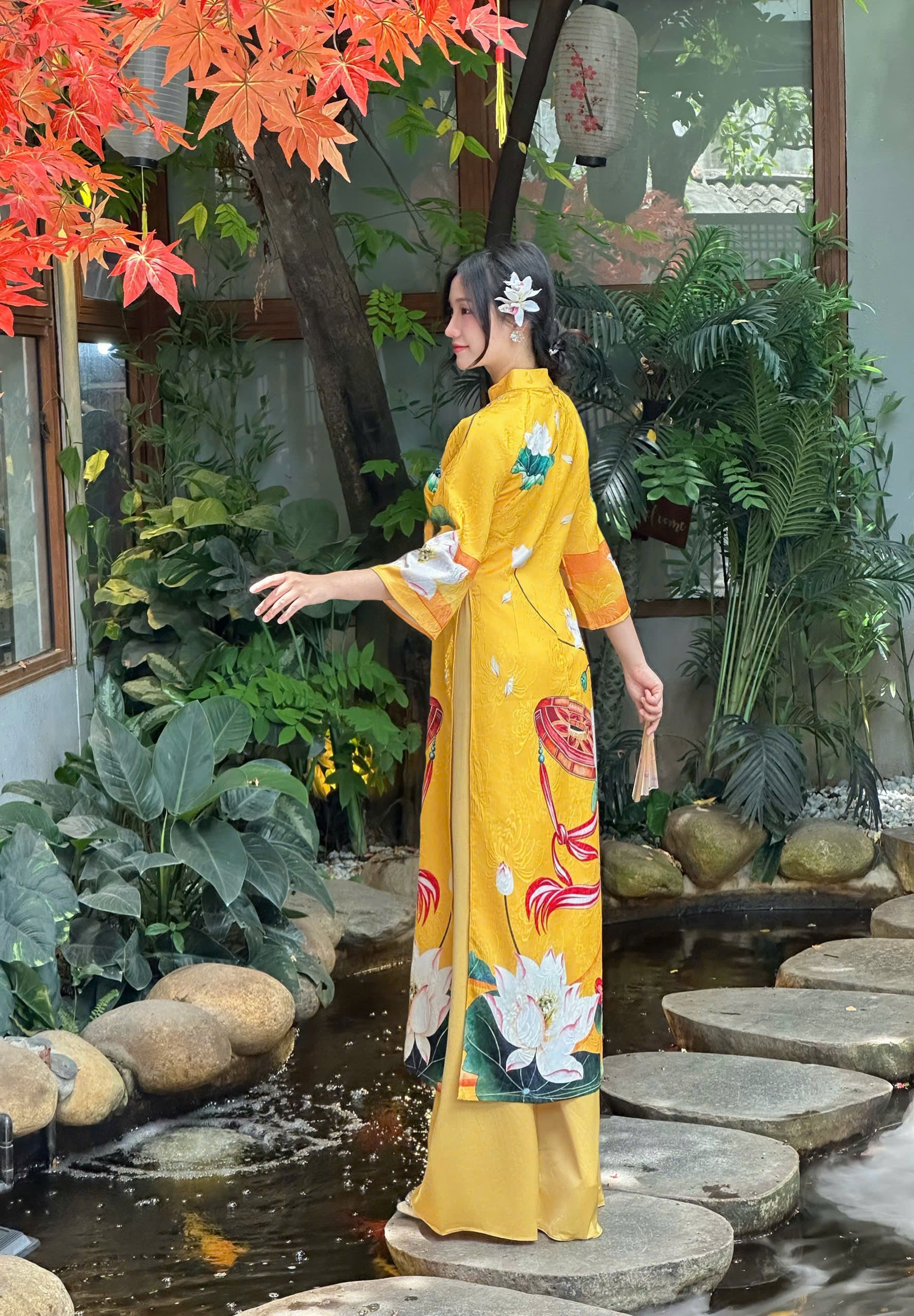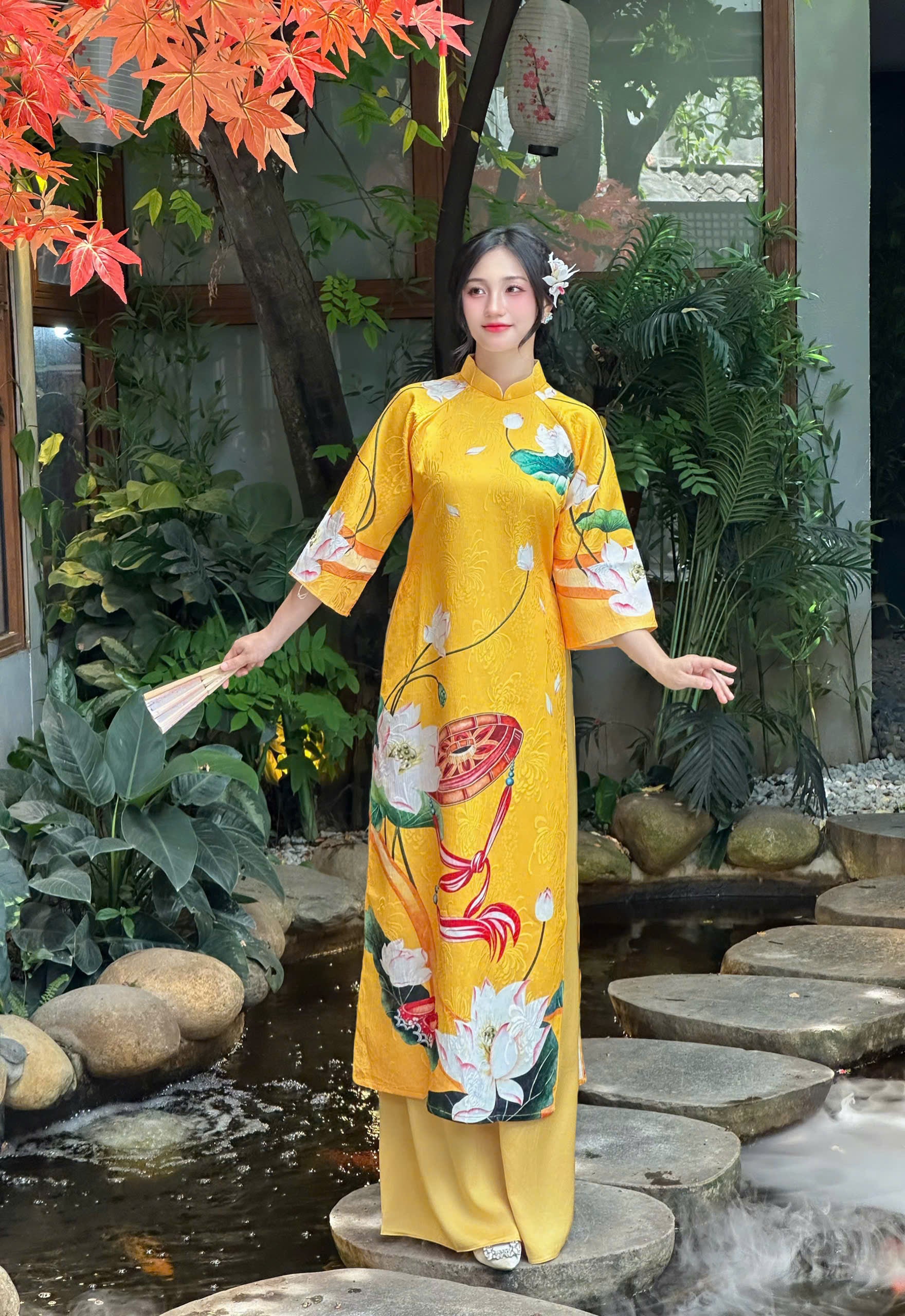 Vietnamese Yellow Ao Dai with Lotus & Conical Hat Pattern – Traditional Festival Dress for Women | No Pants