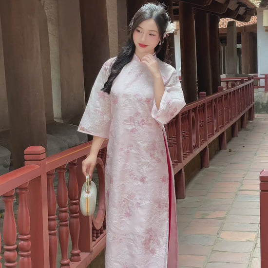 A refreshing touch of nature and grace, delicately crafted from soft to tam silk and beautifully embroidered with cherry blossom motifs. This design blends traditional charm with modern grace, perfect for special occasions such as Lunar New Year (Tết), engagement ceremonies, pre-wedding shoots, or cultural celebrations.