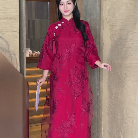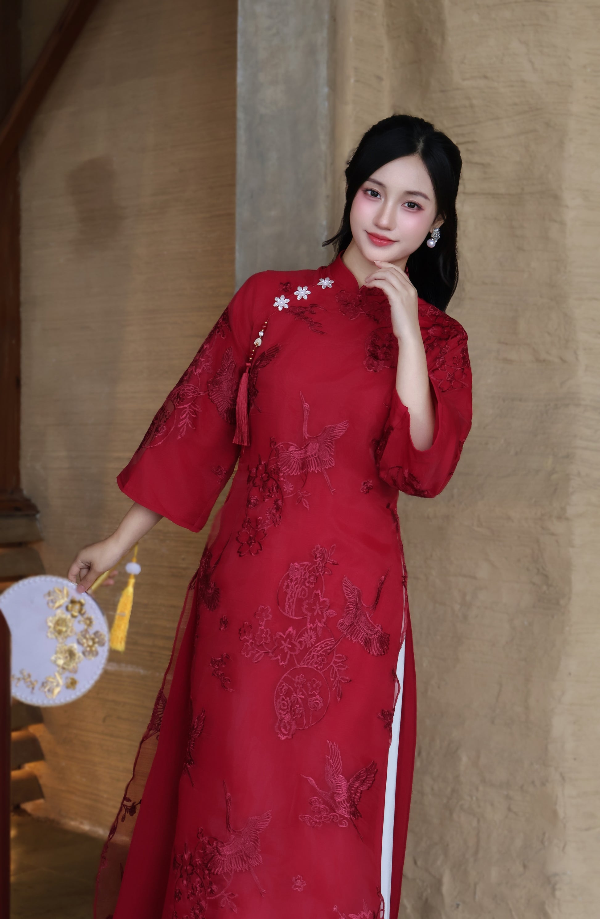 A refreshing touch of nature and grace, delicately crafted from soft chiffon and beautifully embroidered with cherry blossom motifs. This design blends traditional charm with modern grace, perfect for special occasions such as Lunar New Year (Tết), engagement ceremonies, pre-wedding shoots, or cultural celebrations.