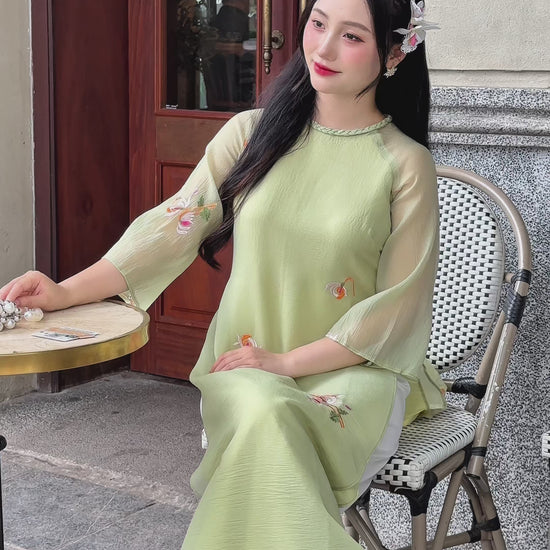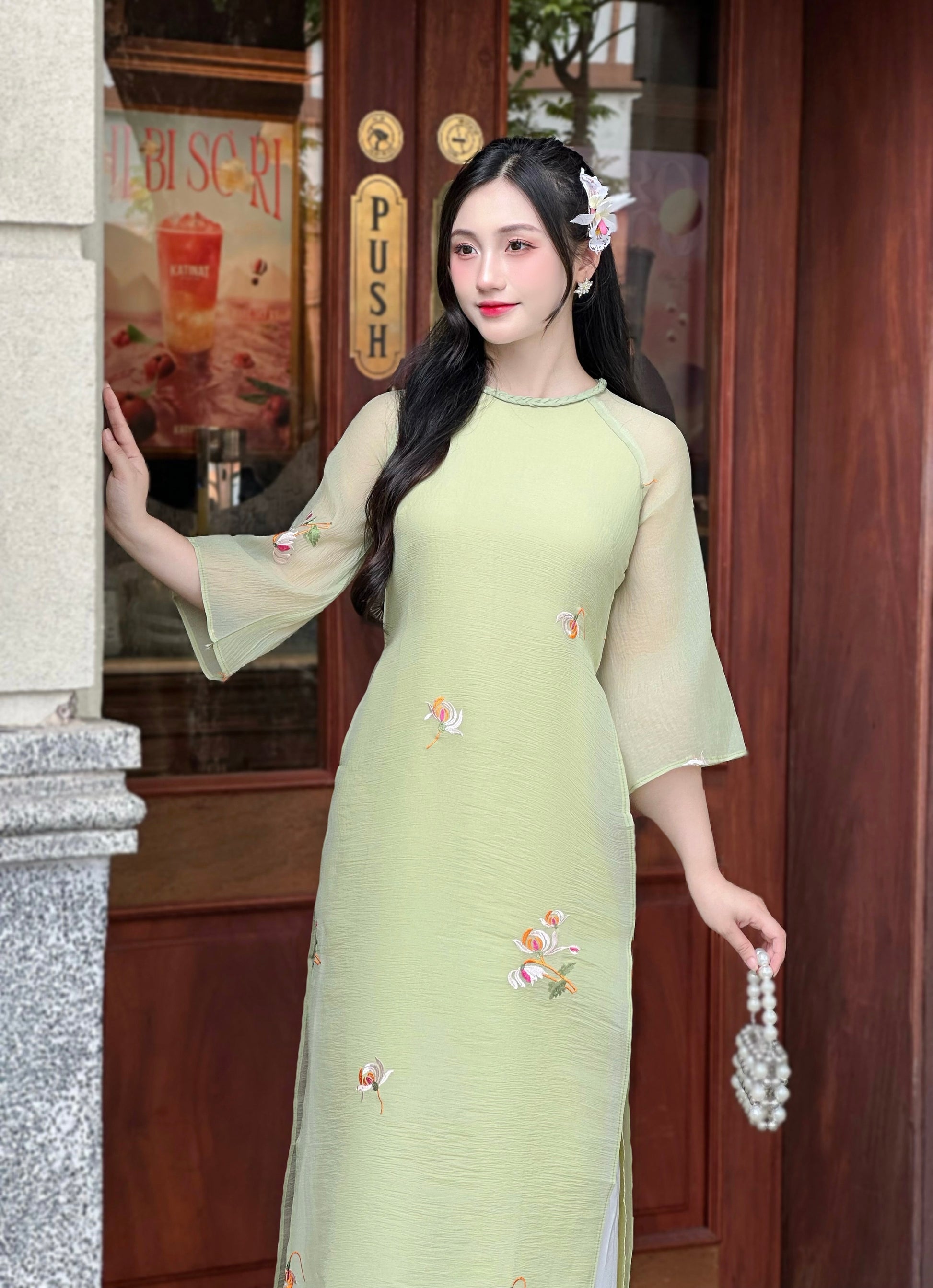 A refreshing touch of nature and grace, delicately crafted from soft chiffon and beautifully embroidered with cherry blossom motifs. This design blends traditional charm with modern grace, perfect for special occasions such as Lunar New Year (Tết), engagement ceremonies, pre-wedding shoots, or cultural celebrations.