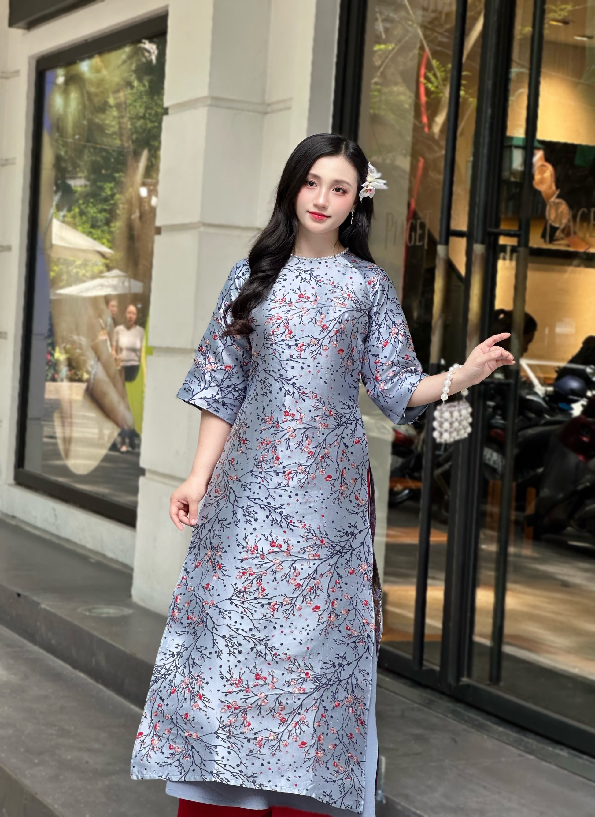 DUSTY BLue modern ao dai with Cherry Blossom | áo dài cách tân | Ao dai women | NO pants